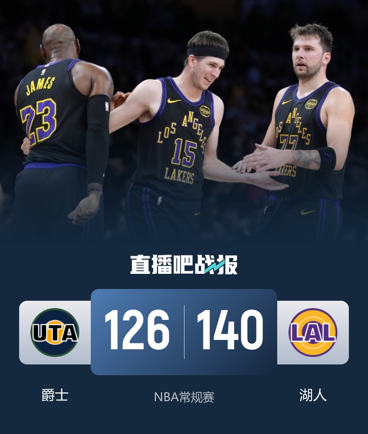 首节对决阵容齐整的湖人却表现慢热,他们在7分钟里仅得10分,反倒是爵士反客为主,乔治命中三记三分带队送上21-10的攻势奠定首节领先;次节湖人三大核心合力砍下29分,不过湖人这一节虽然轰下40分但也丢了35分,爵士无惧对攻带着4分领先进入下半场。休息归来爵士攻势回落,湖人则在末段轮换阶段保留东契奇和詹姆斯,前者连砍12分几乎一人之力送上一波21-5的攻势拉开比分。末节湖人轮换阵容依旧神勇,节中里夫斯带队轰出16-2的攻势拉开19分的优势杀死比赛悬念。最终,湖人主场击败爵士拿下比赛。