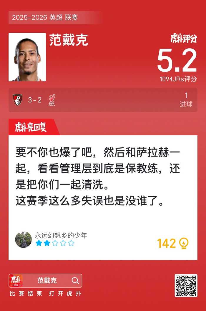 #伯恩茅斯3比2利物浦#范戴克这场比赛,你觉得踢得如何?